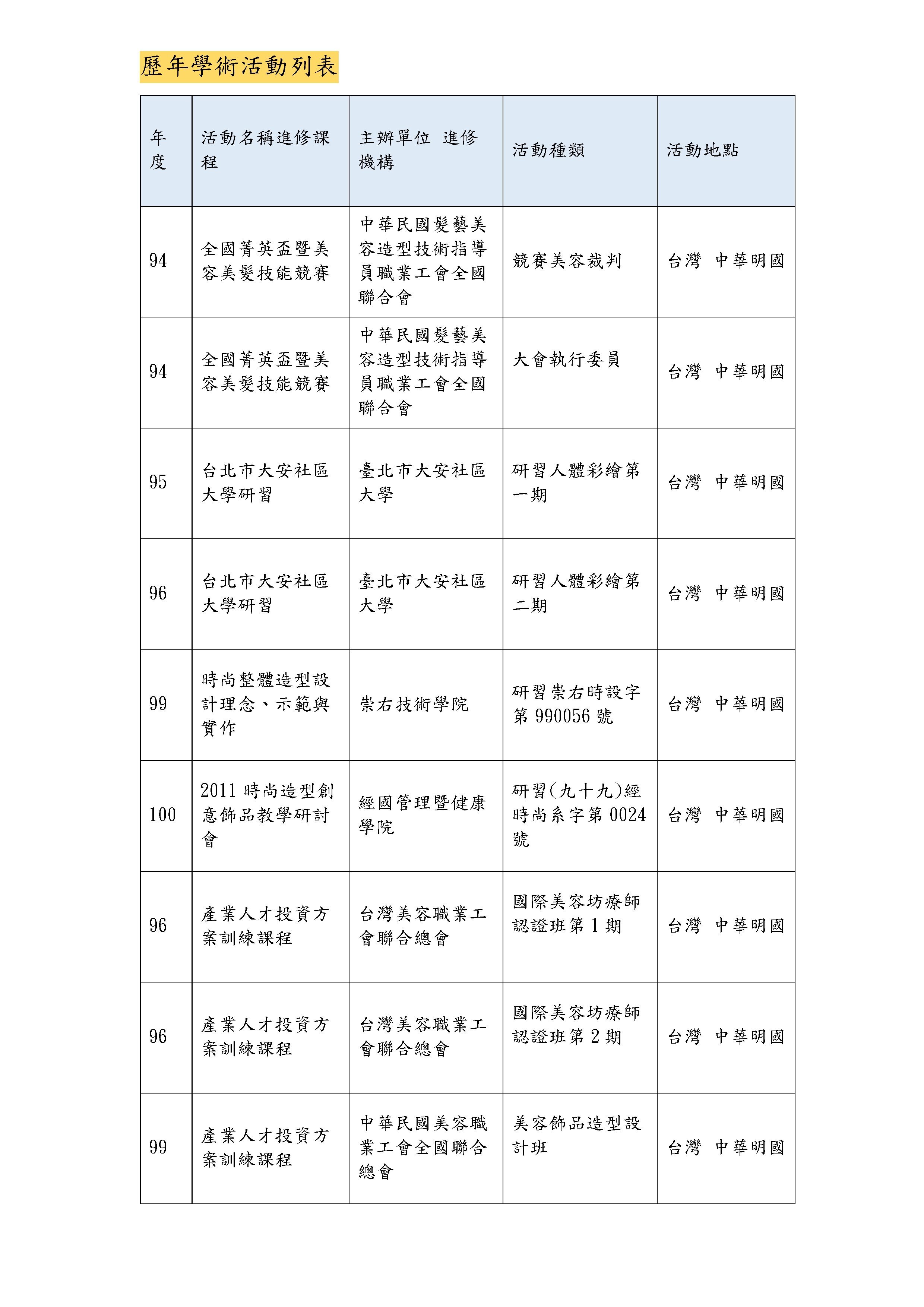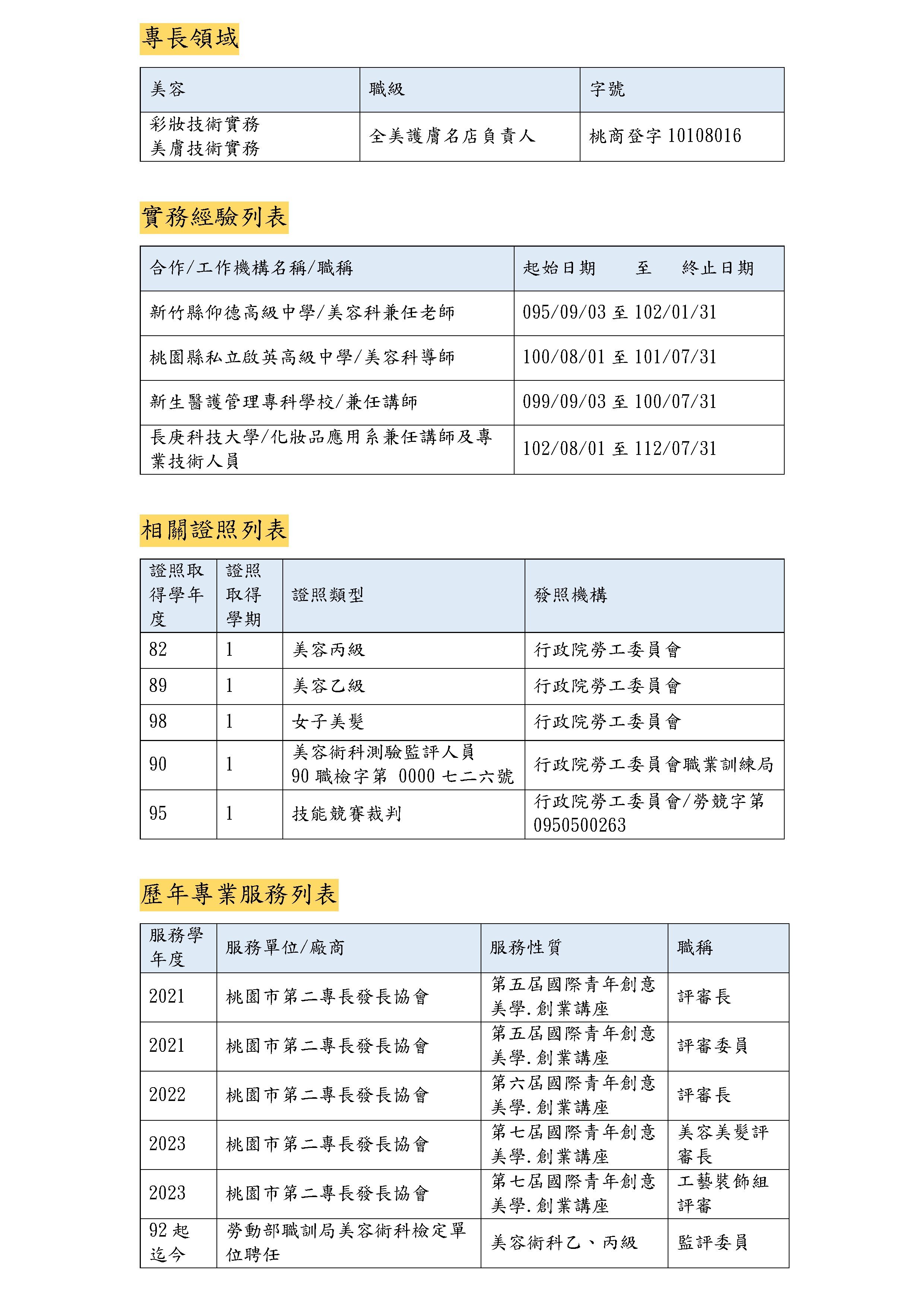 專長領域:彩妝技術實務、進階彩妝技術實務、美膚技術實務、進階美膚技術實務、生活科學、客語薪傳